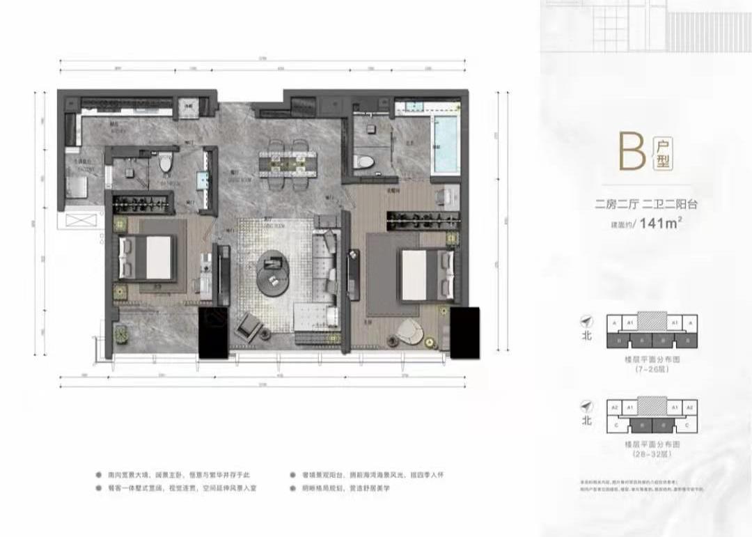 高層遠眺前海灣海景,一覽中央綠軸城市繁華,俯瞰科技島建筑藝術群,豐富景觀體驗。