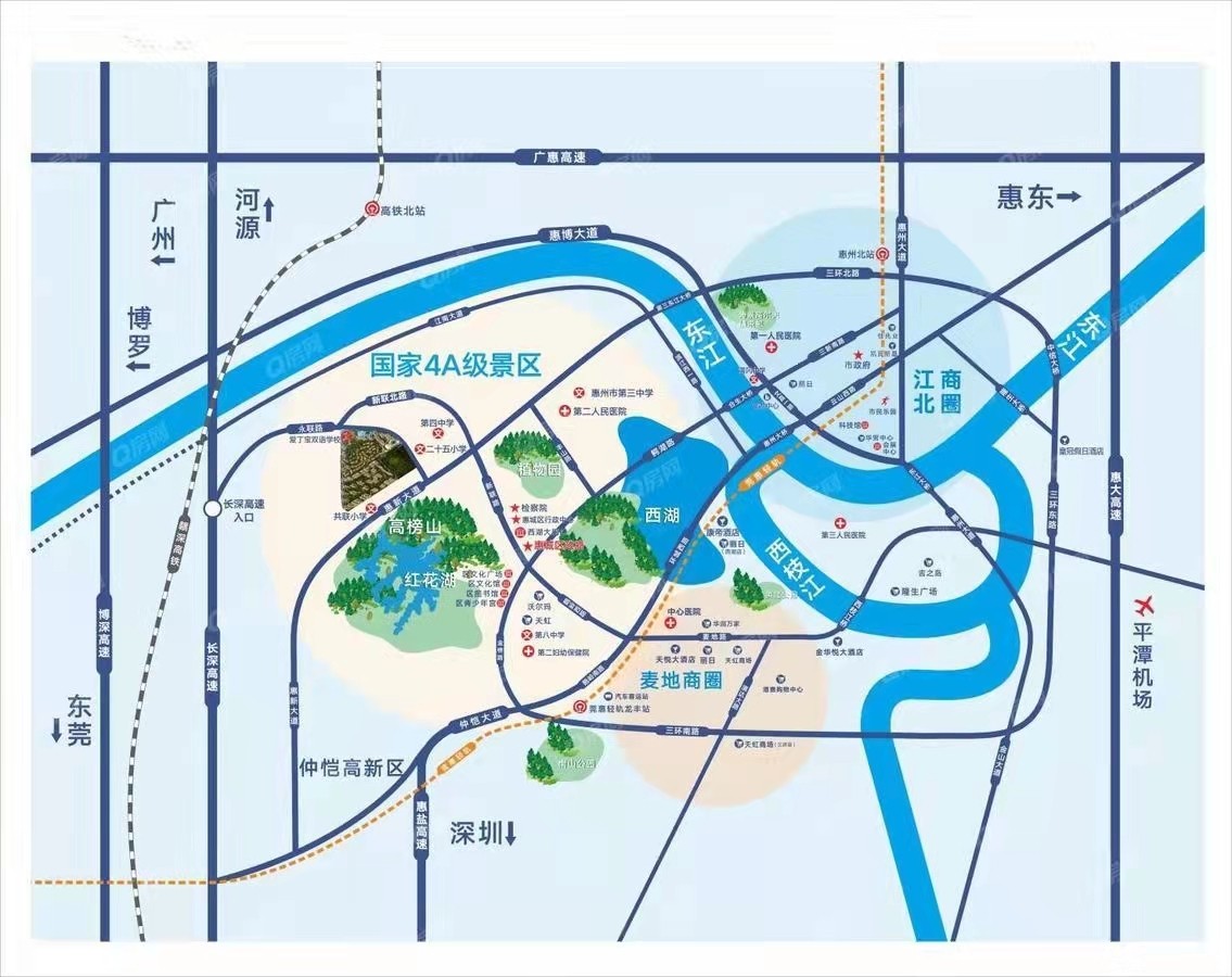 2、 高榜山、紅花湖,私藏一城自然資源,在惠州西筑家,把高榜山、紅花湖納為后花園,享受生態圈清新空氣和靜謐,尊貴居住無可比擬。近長深高速火車西站出口,快速通達深圳、東莞、廣東。永聯路北段八車道,南段雙向六車道即將全部完工通車。此外雙向八車道的新聯北路也在快速建設中。